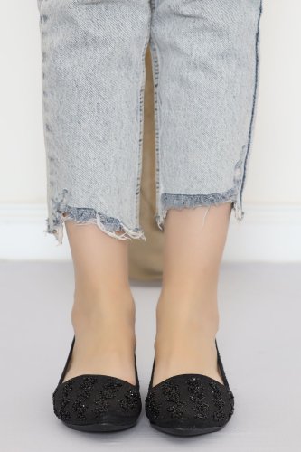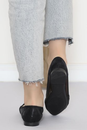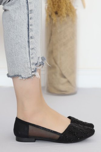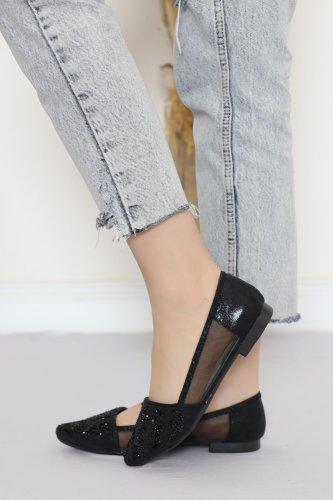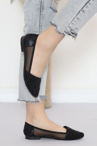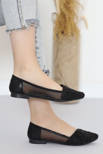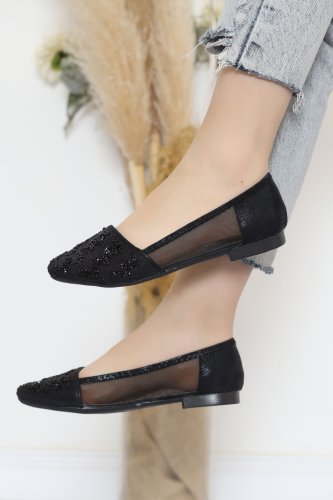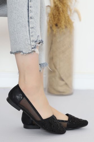 Yanları Tüllü Taş Detaylı Babet Siyah