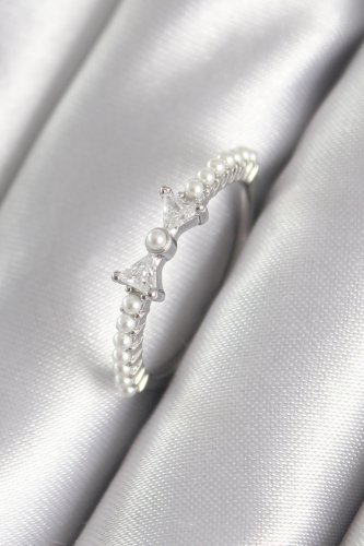 Pirinç Gümüş Renk Zirkon Taşlı Kurdele Model İnci Detay Kadın Yüzük