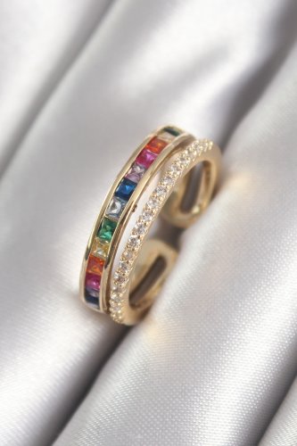 Pirinç Gold Renk Renkli Zirkon Taşlı Kadın Yüzük