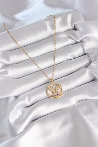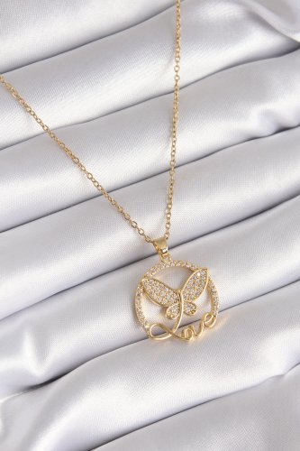 316L Çelik Gold Renk Zirkon Taşlı Kelebek Love Model Kadın Kolye