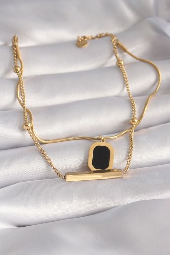 316L Çelik Gold Renk 2li Zincir Model Siyah Kare Figür Kadın Bileklik