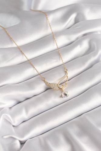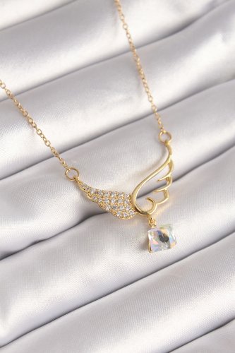 316L Çelik Gold Renk Zincir Zirkon Taşlı Kanat Model Sallantı Zirkon Taş Detay Kadın Kolye