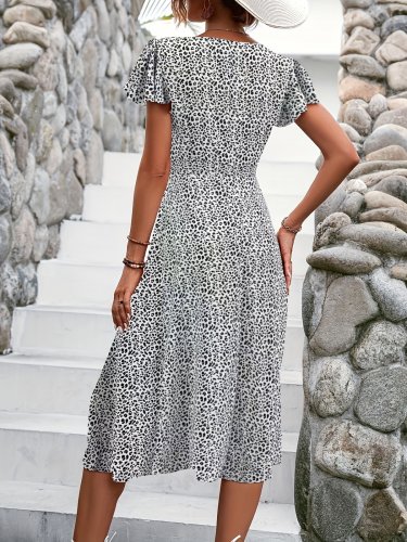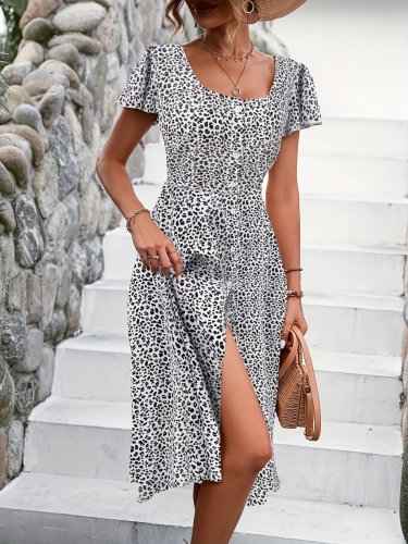 Kadın kısa kollu önü düğmeli u yaka volanlı minik leopar desen midi viskon elbise
