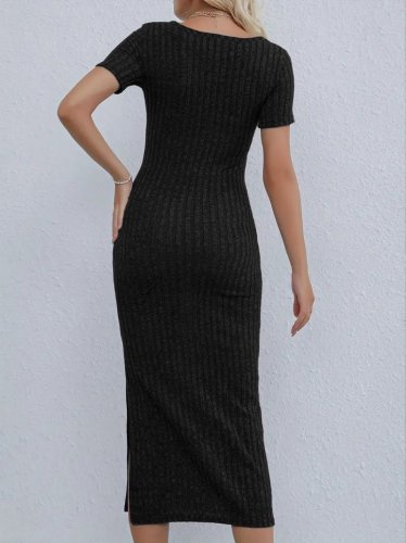 Kadın kısa kollu kare yaka yandan yırtmaçlı fitilli kaşkorse midi boy elbise