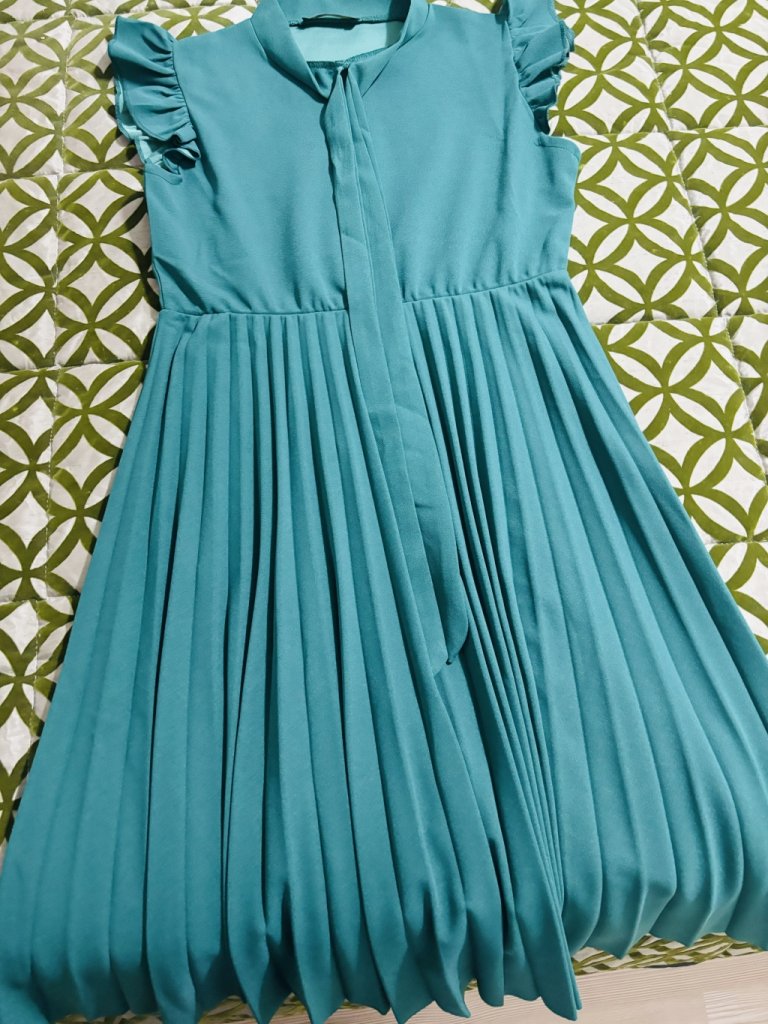 Kadın kısa kollu boyundan bağcıklı eteği pileli ithal krep elbise