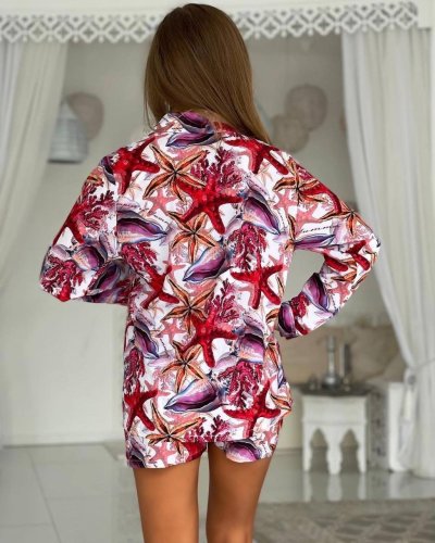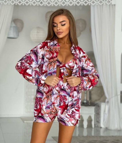 Kadın dijital baskılı jesica kumaş gömlek şort büstiyer 3 lü takım