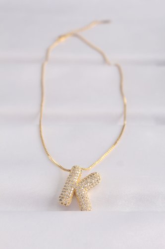 316L Çelik Zincirli Zirkon Taşlı K Harfli Gold Renk Bubble Kolye