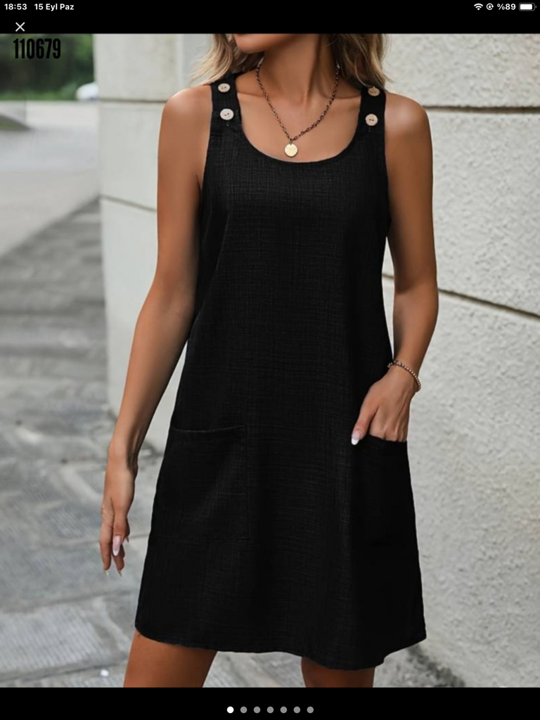 Kadın kolsuz kalın askılı düğme detay cepli keten elbise