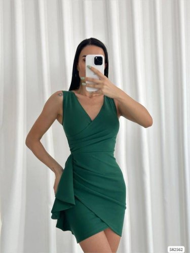 Kadın dalgıç kumaş belde kuşak detaylı V yaka mini boy elbise