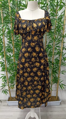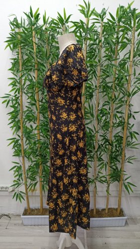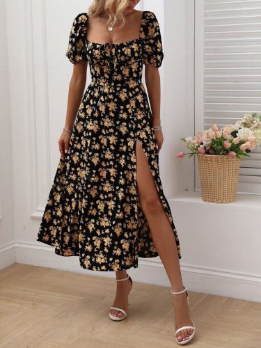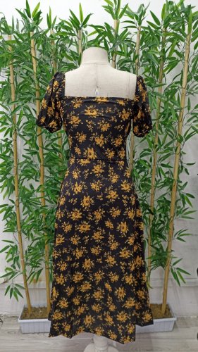 Kadın kısa kollu kare yaka önü büzgü ve bağcık yandan yırtmaç detayçiçek desenli süprem elbise