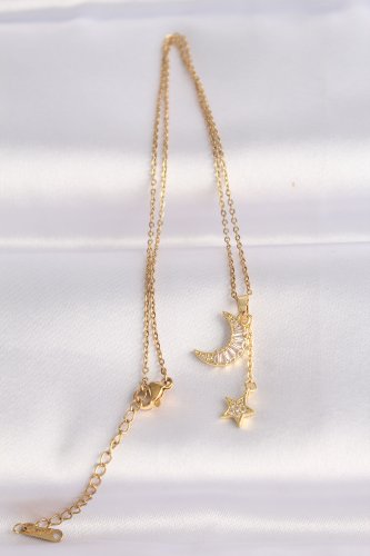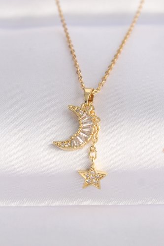 316L Çelik Zincir Altın Renk Zirkon Taşlı Ay Yıldız Kolye