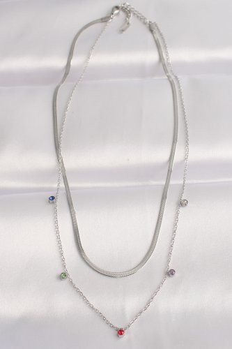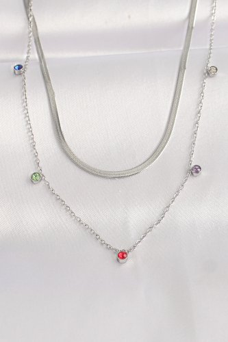 316L Çelik Zincir Gümüş Renk Renkli Zirkon Taşlı 2li Kolye