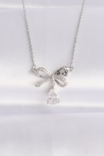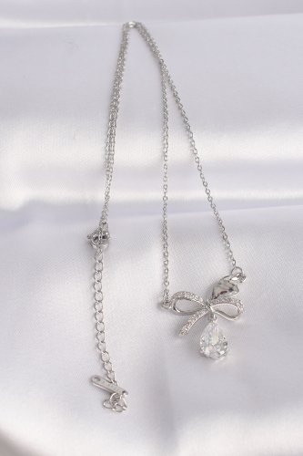316L Çelik Zincir Gümüş Renk Zirkon Taşlı Damla Detay Fiyonk Kolye