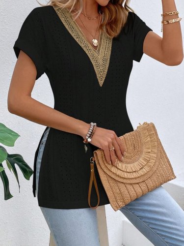 Kadın kısa kollu yaka güpür detay viskon bluz
