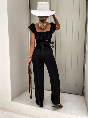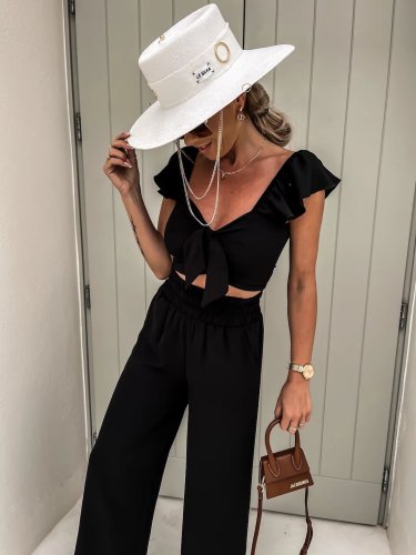 Kadın keten kumaş fiyonk detaylı fırfır askılı pantolon crop ikili takım