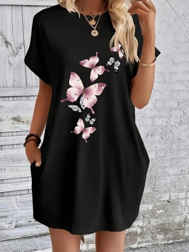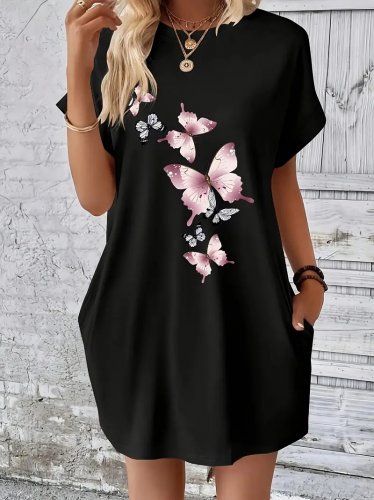 Kadın kısa kollu bisiklet yaka kelebek baskılı cep detay viskon elbise