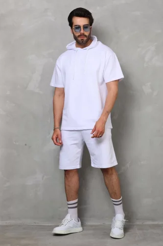 Unisex Kapşonlu Oversize T-Shirt Şortlu Takım - Beyaz