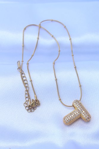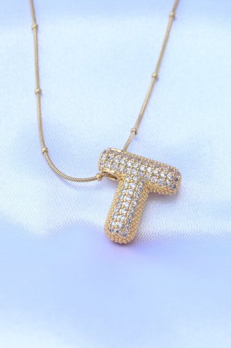 316L Çelik Zincirli Zirkon Taşlı T Harfli Gold Renk Bubble Kolye