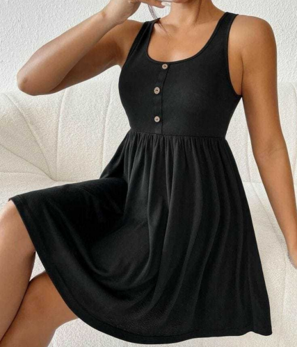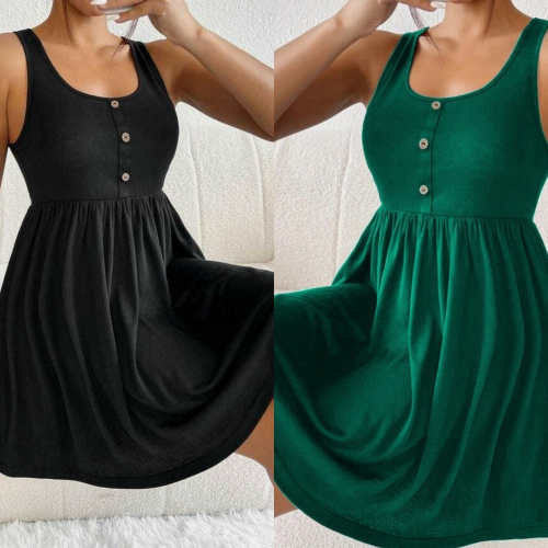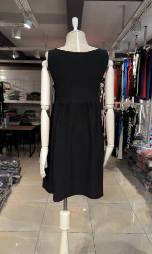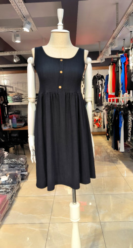 Kadın kalın askılı düğme detay eteği volanlı bürümcük kumaş elbise