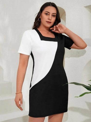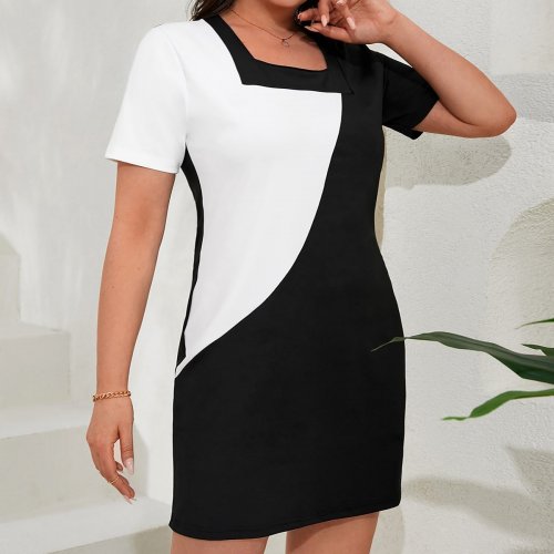 Kadın kısa kollu kare yaka parçalı desen dalgıç elbise