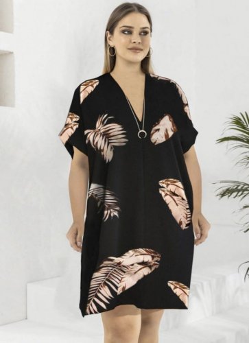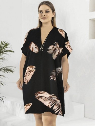 Kadın kısa kollu V yaka yaprak desen mikro kumaş elbise