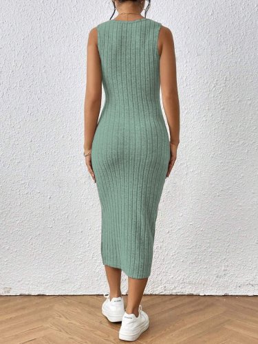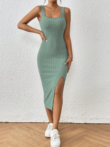 Kadın kolsuz kare yaka önü yırtmaç detay fitilli kaşkorse elbise