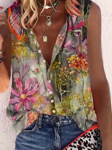 Kadın sıfır kol v yakalı önden düğmeli dokuma çiçek desen baskılı gömlek