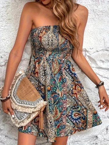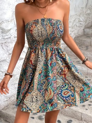 Kadın straplez belden gipeli dijital desenli süprem elbise