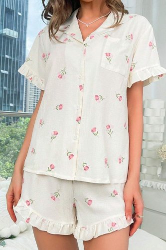 Ekru Desenli Düğmeli Şort Takım 7529