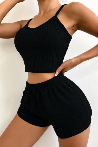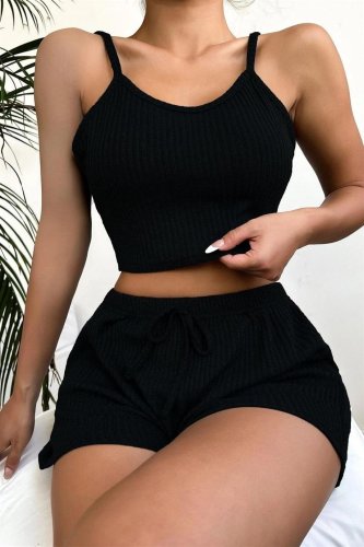 Viskon Siyah Askılı Crop Şortlu Takım 7011