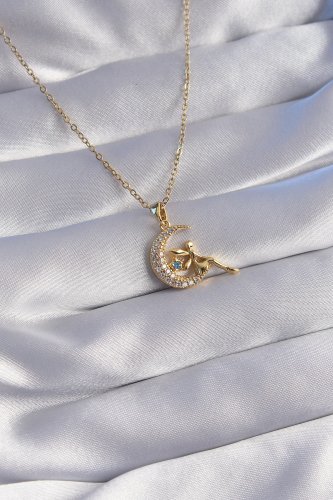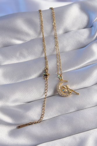 316L Çelik Zincir Gold Renk Peri Figürlü Zirkon Taşlı Ay Tasarımlı Kolye