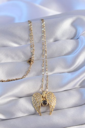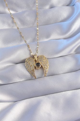 316L Çelik Zincir Gold Renk Zirkon Taşlı Kanat Figürlü Projeksiyon Kolye