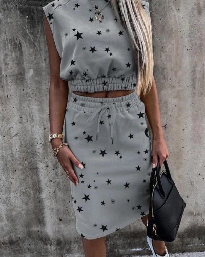 Kadın bisiklet yaka kolsuz yıldız baskılı yazlık iki iplik kumaş ikili takım