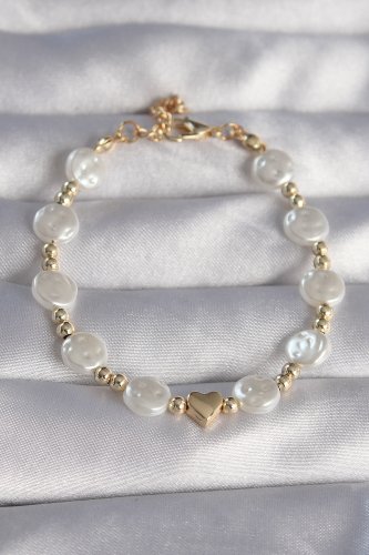 Gold Renk Sıralı İnci Taşlı Kalp Figürlü Bileklik