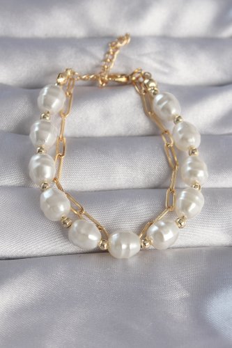 Gold Renk Sıralı İnci Taşlı Zincirli 2li Bileklik