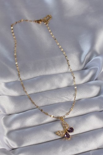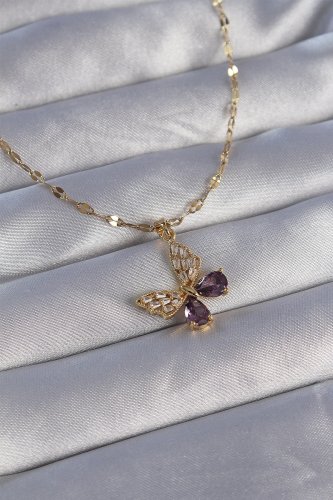 316L Çelik Zincirli Gold Renk Mor Zirkon Taş Kelebek Tasarımlı Kolye