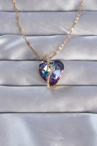 316L Çelik Zincirli Gold Zirkon Taşlı Yıldız Detay Kristal Taşlı Mor Kalp Tasarımlı Kolye