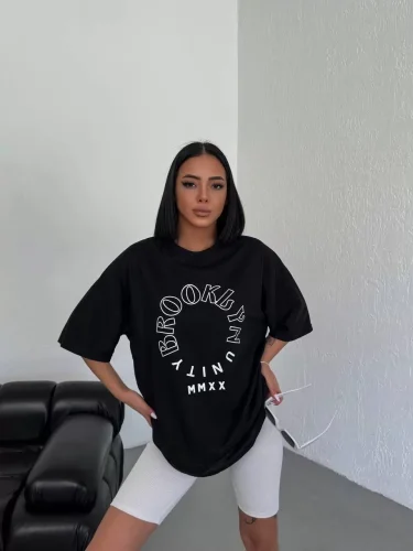 Unisex Bisiklet Yaka Baskılı Oversize T-Shirt - Siyah