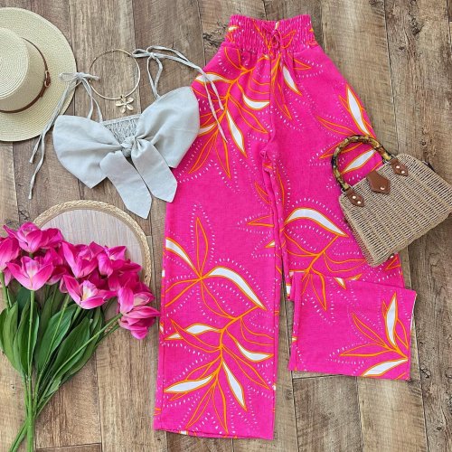 Kadın keten kumaş fiyonk detaylı crop ve bol kesim desenli pantolon ikili takım