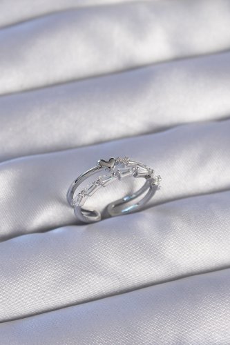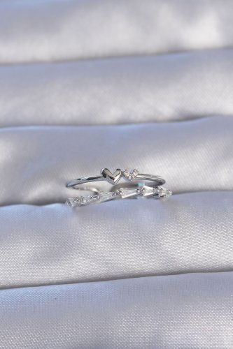 Pirinç Gümüş Renk Zirkon Taşlı Kalpli 2li Görünüm Ayarlanabilir Yüzük