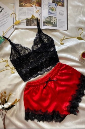 Kırmızı Dantelli Zerafet İkili Saten Şort Takımı S-7550