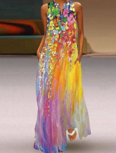 Kadın çentik yaka sıfır kol süprem kumaş çiçek desenli elbise