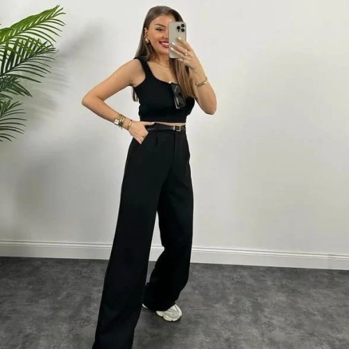 Kadın double palazzo kumaş yüksek bel bol kesim pantolon