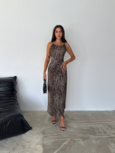 Kadın krep kumaş desenli yırtmaç detaylı sıfır yok maxi boy elbise