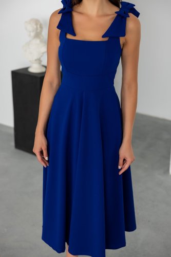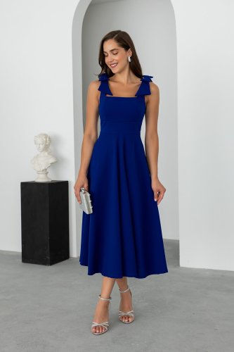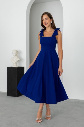Kadın krep kumaş kare yaka omuzda fiyonk detaylı midi boy elbise