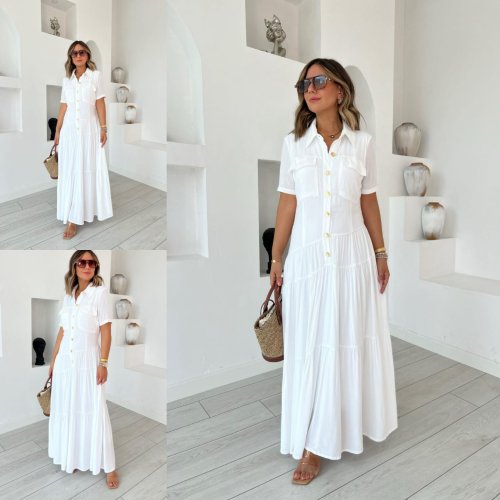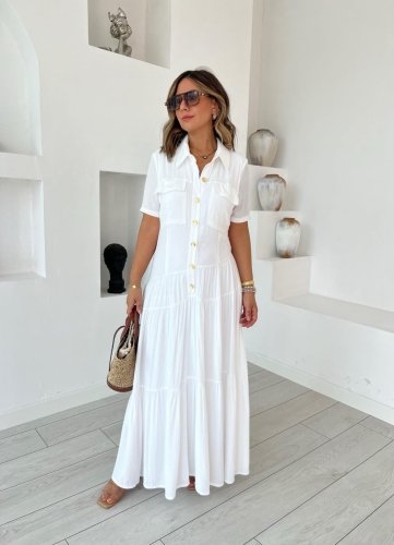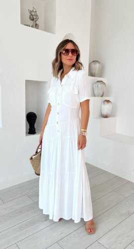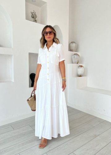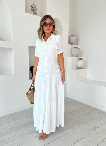 Kadın dokuma kumaş cep detaylı maxi boy gömlek elbise