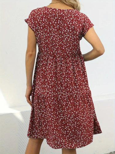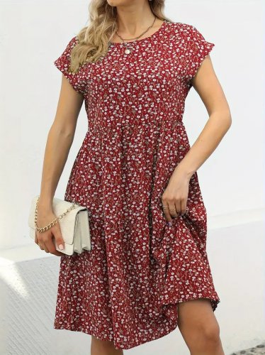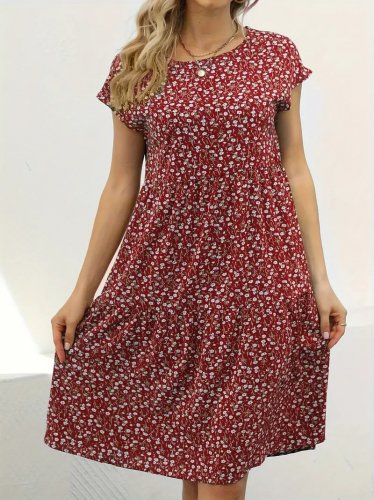 Kadın kısa kollu bisiklet yaka çiçek baskılı süprem elbise