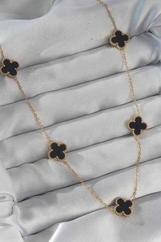 316L Çelik Zincir Gold Renk Siyah Mineli Yonca Kolye