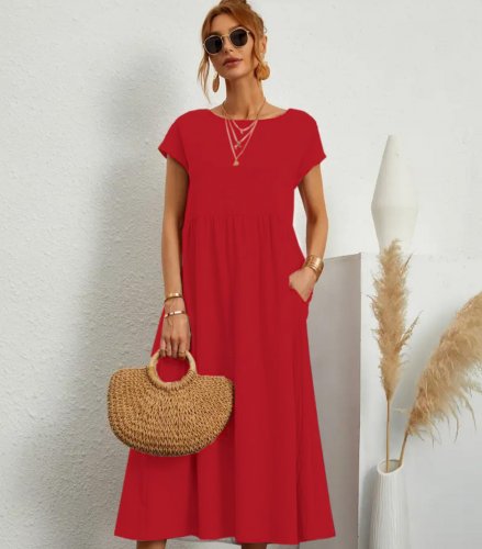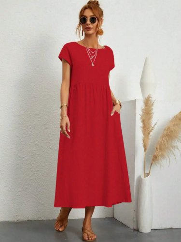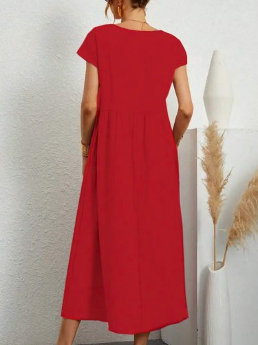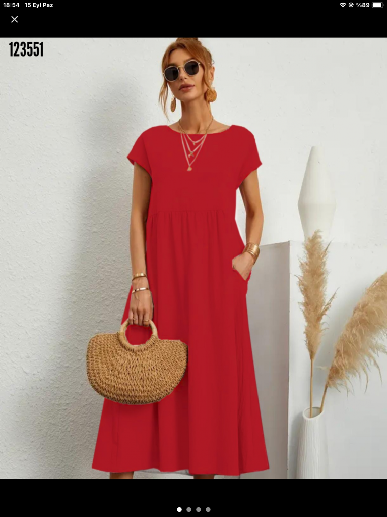 Kadın kısa kollu bel büzgü detay bürümcük midi boy salaş elbise