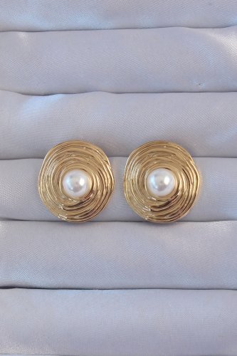 316L Çelik Gold Renk İnci Detay Oval Kıvrımlı Vintage Küpe